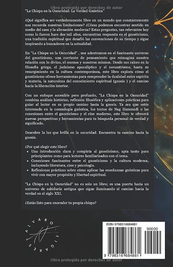 Con un enfoque accesible pero profundo, «La Chispa en la Oscuridad» combina análisis histórico, reflexión filosófica y aplicaciones prácticas para guiar al lector en su propio camino hacia la gnosis. Ya sea que estés interesado en la cosmología gnóstica, los textos de Nag Hammadi o las conexiones entre el gnosticismo y el cine moderno, este libro te ofrecerá nuevas perspectivas y herramientas para tu búsqueda personal de verdad y significado.