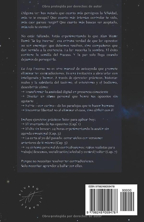 En La Ley Inversa, el escritor e investigador Álvaro Figares te invita a soltar la búsqueda obsesiva del equilibrio perfecto para descubrir algo más liberador: el arte de bailar con las paradojas. A través de historias íntimas (el despido que coincidió con el éxito literario, la novela fallida que dio vida a esta obra) y la sabiduría de Alan Watts, el taoísmo y el estoicismo reinterpretados para la era digital, aprenderás a: